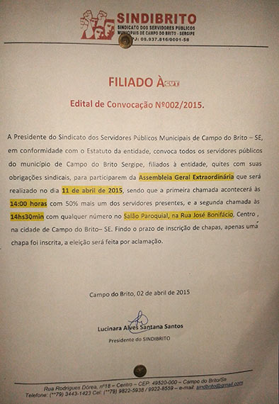 A Presidente do Sindicato dos Servidores Públicos Municipais de Campo do Brito-SE, em conformidade com o Estatuto da entidade, convoca todos os servidores públicos do município de Campo do Brito, filiados à entidade, quites com suas obrigações sindicais, para participarem da Assembleia Geral Extraordinária que será realizado no dia 11 de abril de 2015, sendo que a primeira chamada acontecerá às 14h com 50% mais um dos servidores presentes, e a segunda chamada às 14h30 com qualquer número no Salão Paroquial, na Rua José Bonifácio, centro, na cidade de Campo do Brito-SE. Findo o prazo de inscrições de chapas, apenas uma chapa foi inscrita, a eleição será feita por aclamação.