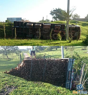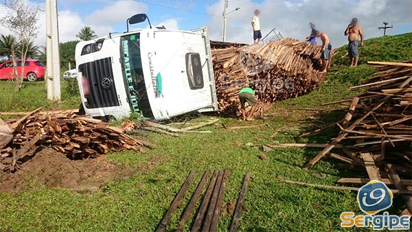 No início desta quarta-feira, 08, por volta das 6h40 um caminhão licenciado em Areia Branca, carregado de madeira tombou em Campo do Brito.