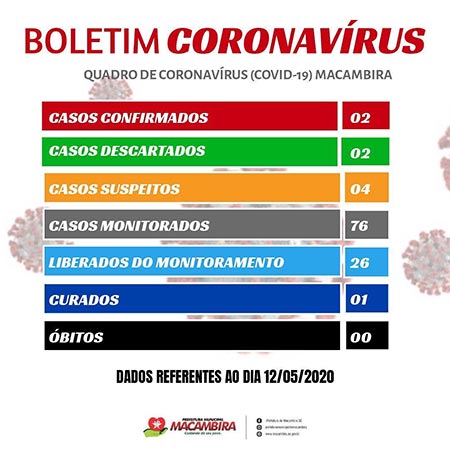 O boletim epidemiológico desta terça-feira, 12, produzido pela Secretaria Municipal de Saúde do município de Macambira, mostrou o registro da primeira cura e mais um caso confirmado do novo Coronavírus (Covid-19).
