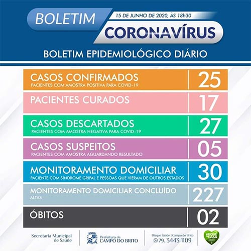 A equipe técnica da Secretaria Municipal de Saúde de Campo do Brito divulgou nesta segunda-feira, 15, boletim epidemiológico atualizado.