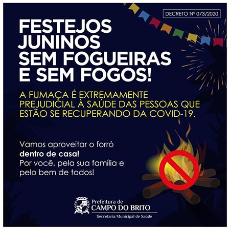 A Prefeitura Municipal de Campo do Brito emitiu uma nota no dia 21, recomendando que a população de Campo do Brito se abstenha de acender fogueira e soltar fogos durante o período junino em tempos de pandemia.