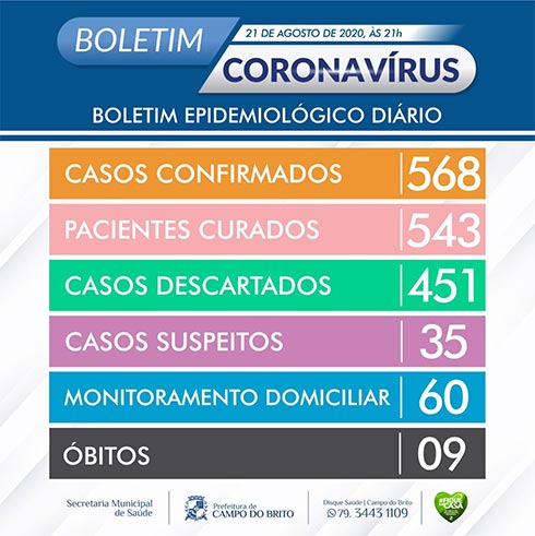 A equipe técnica da Secretaria Municipal de Saúde de Campo do Brito divulgou nesta sexta-feira, 21, o boletim epidemiológico atualizado com oito novos casos confirmados de Covid-19.