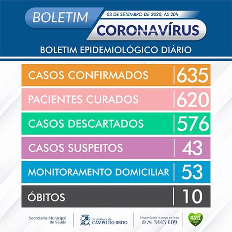 Campo do Brito soma desde o início da pandemia do novo coronavírus 635 casos confirmados da doença.