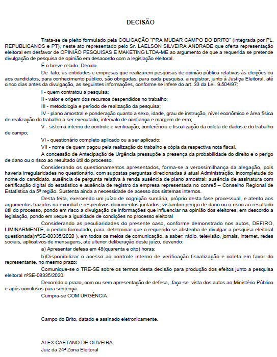 A decisão proferida pelo juiz Alex Caetano de Oliveira da 24ª Zona Eleitoral atendeu a coligação Pra Mudar Campo do Brito (integrada por PL, REPUBLICANOS e PT), que ingressou com uma representação eleitoral em desfavor da empresa Opinião Pesquisas e Marketing LTDA ao argumento de que a mesma pretende divulgar pesquisa de opinião em desacordo com a legislação eleitoral. A divulgação da pesquisa registrada no TSE ocorreria nesta segunda-feira, 09.