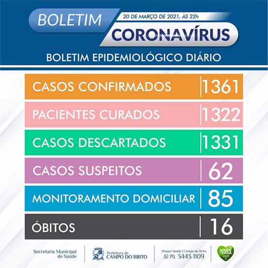 No boletim do dia, em Campo do Brito foram registrados desde o início da pandemia 1361 casos confirmados, 23 seguem em tratamento (ativos) e 1322 já estão recuperados.