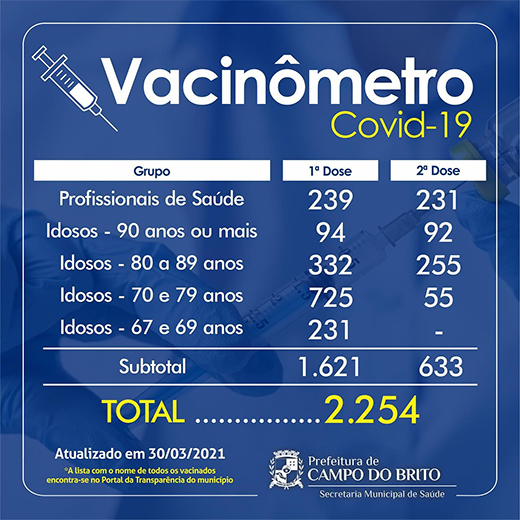 Cerca de 1621 pessoas receberam ao menos uma dose da vacina contra a Covid-19 em Campo do Brito até esta terça-feira (30), segundo balanço divulgado pela Secretaria Municipal de Saúde.