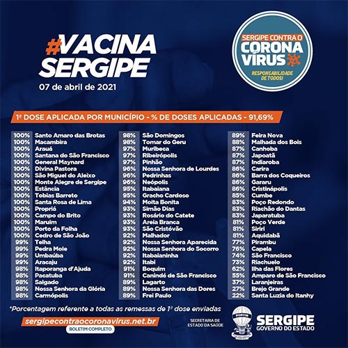 Até o momento apenas 16 municípios do estado aplicaram 100% das 1ª doses recebidas. Os dados foram divulgados no boletim desta quarta-feira, segundo dados da Secretaria de Estado da Saúde (SES/SE).