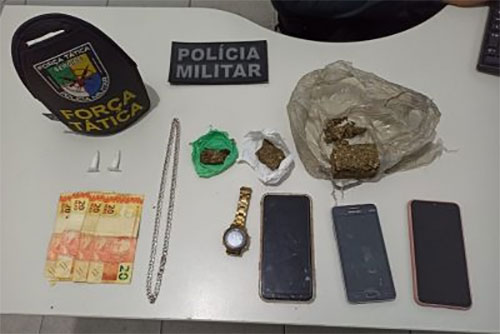 Diante das suspeitas, a equipe policial intensificou as rondas na região e localizou o suspeito na porta da residência. Após busca pessoal, ele foi flagrado com dois pinos de cocaína e duas buchas de maconha no bolso da bermuda.