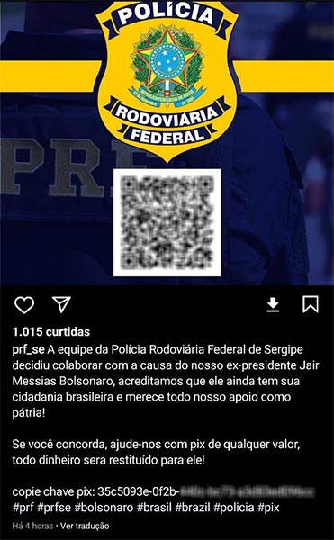 A publicação, possuía um texto informando que a equipe da Polícia Rodoviária Federal de Sergipe decidiu “colaborar” com a causa do ex-presidente e trazia um card com um QR Code onde seria possível fazer a “doação”.