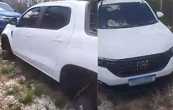 Por volta do meio-dia, as equipes foram acionadas para verificar a situação do veículo sem os quatro pneus. A caminhonete foi identificada como produto de roubo e furto após inspeção.
