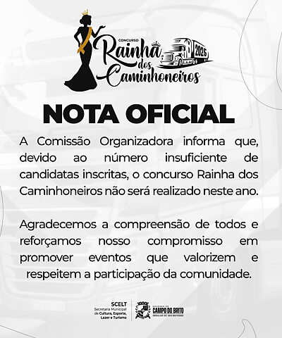 A Comissão Organizadora do tradicional concurso Rainha dos Caminhoneiros de Campo do Brito informou, por meio de nota oficial, que a edição de 2025 não será realizada. O cancelamento ocorreu devido ao número insuficiente de candidatas inscritas.