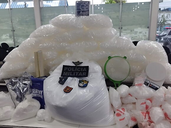 No local informado por ele, no bairro Rotary Club, os agentes localizaram uma estrutura montada para o preparo e fracionamento do entorpecente. Foram apreendidos 4.482 pinos cheios de cocaína, 34 kg de insumos, 26 bolsas contendo 13 mil pinos vazios, uma balança de precisão e dois celulares.