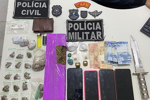 Com a autorização do suspeito, os policiais realizaram buscas no imóvel, onde localizaram um tablete de maconha, várias porções de cocaína, duas pedras de crack e outros materiais relacionados ao tráfico de drogas.
